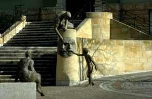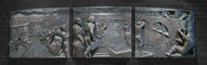 Platzgestaltung Platzgestaltung Aktuelle ArbeitenWellpappeHolzMetallSteinPlatzgestaltungGrafik3D Doppelkopf . 1988 . Bronze vierteilig . Rathausplatz Plochingen Triptychon 1986 . Bronze . Berufsschule Münchberg . 95 x 330 cm